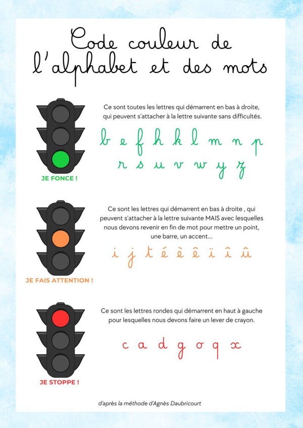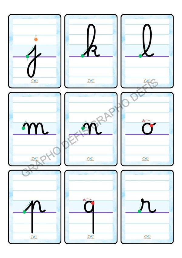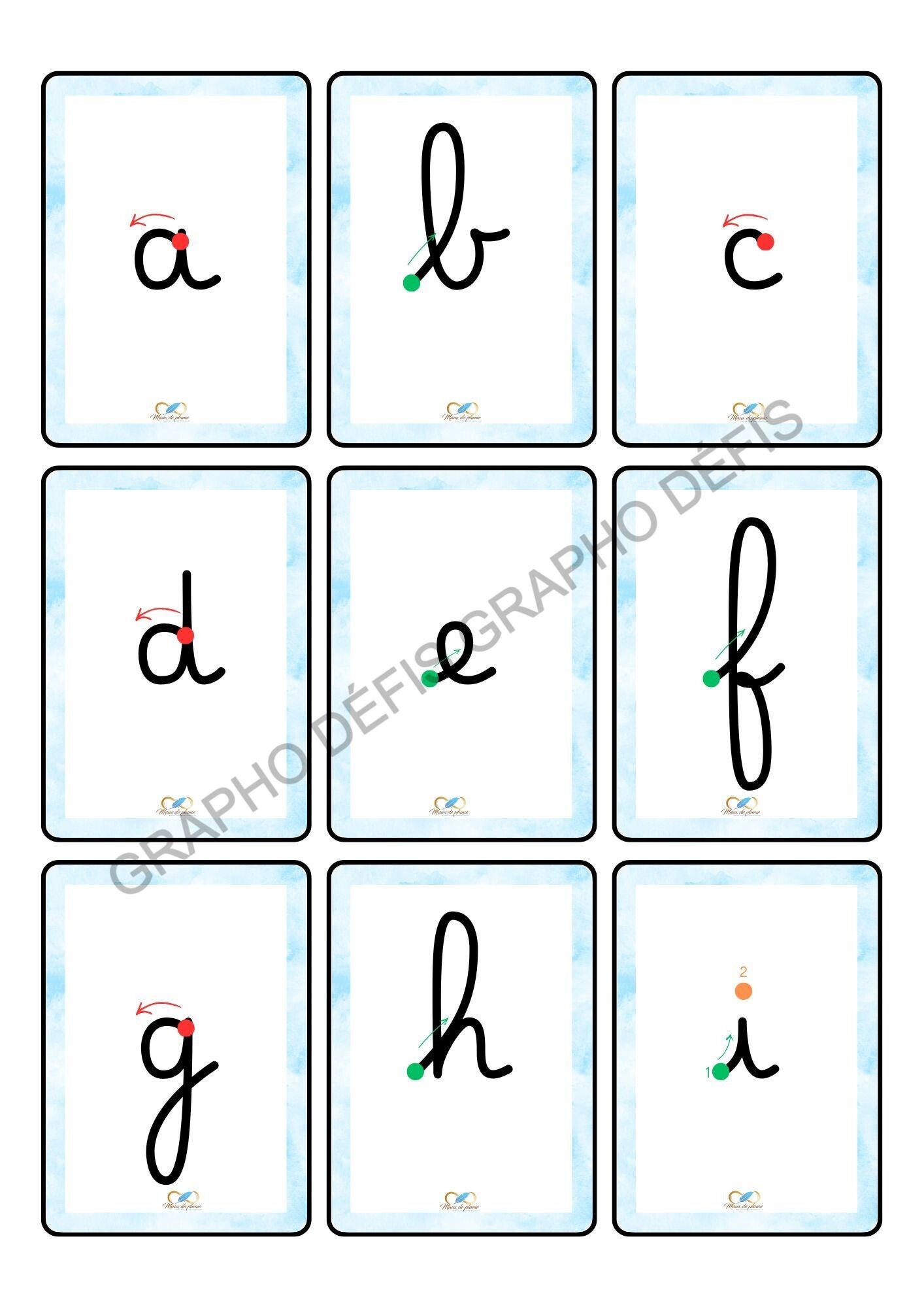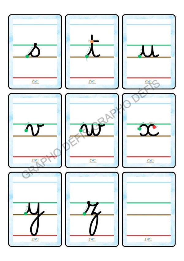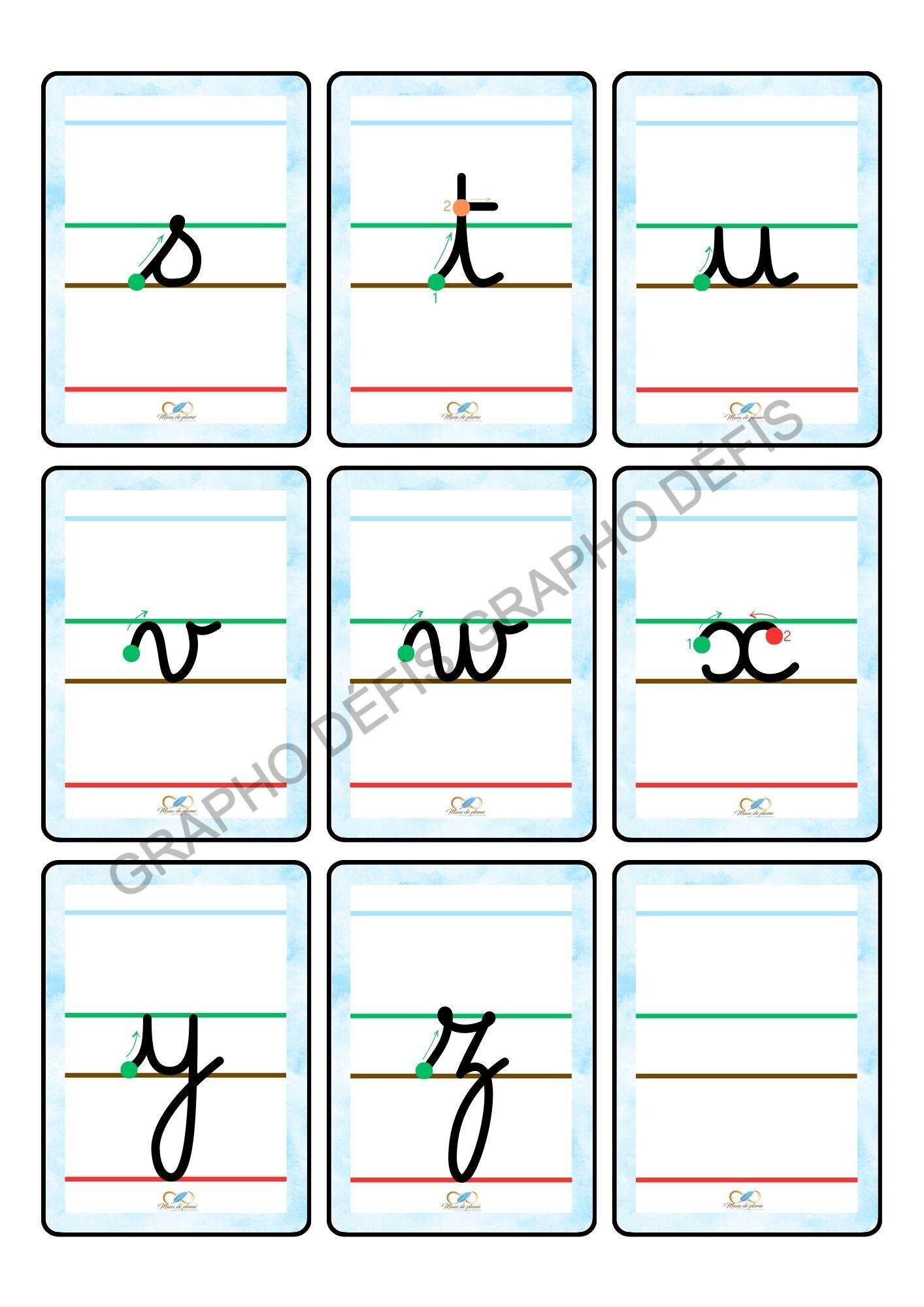 Alphabet en minuscule cursive avec démarrage sans lignage, avec lignage terre... et lignage séyès.