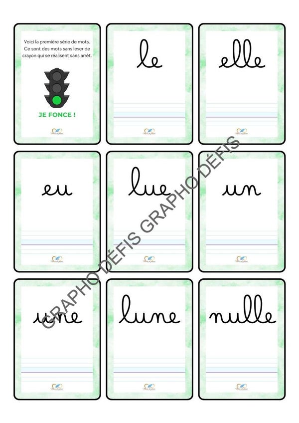 les mots verts, oranges, rouges et tricolores avec indices un alphabet minuscule cursif avec démarrage