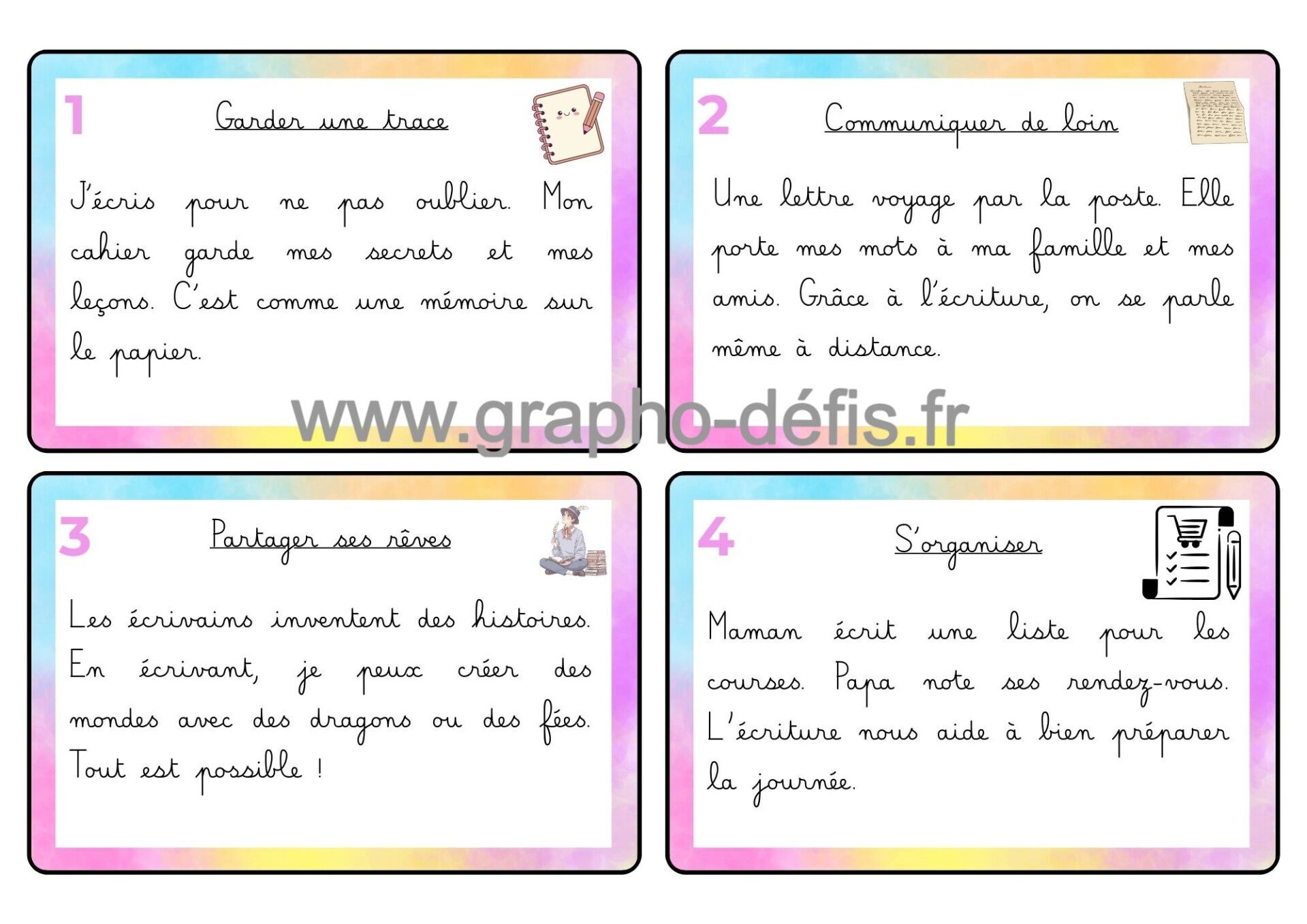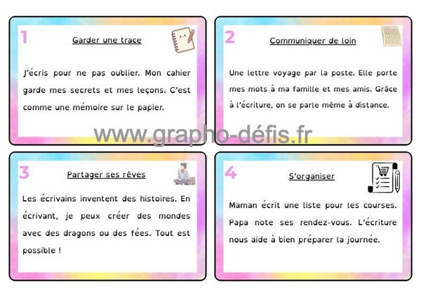 Un rallye copie de 25 petits textes sur l'écriture avec 3 niveaux de difficultés en police belle allure et opendys.