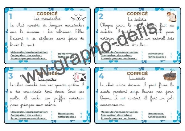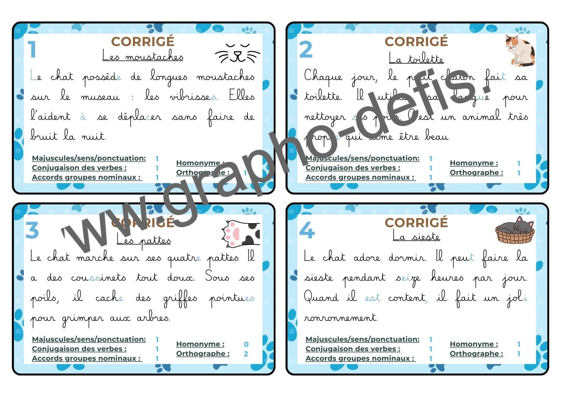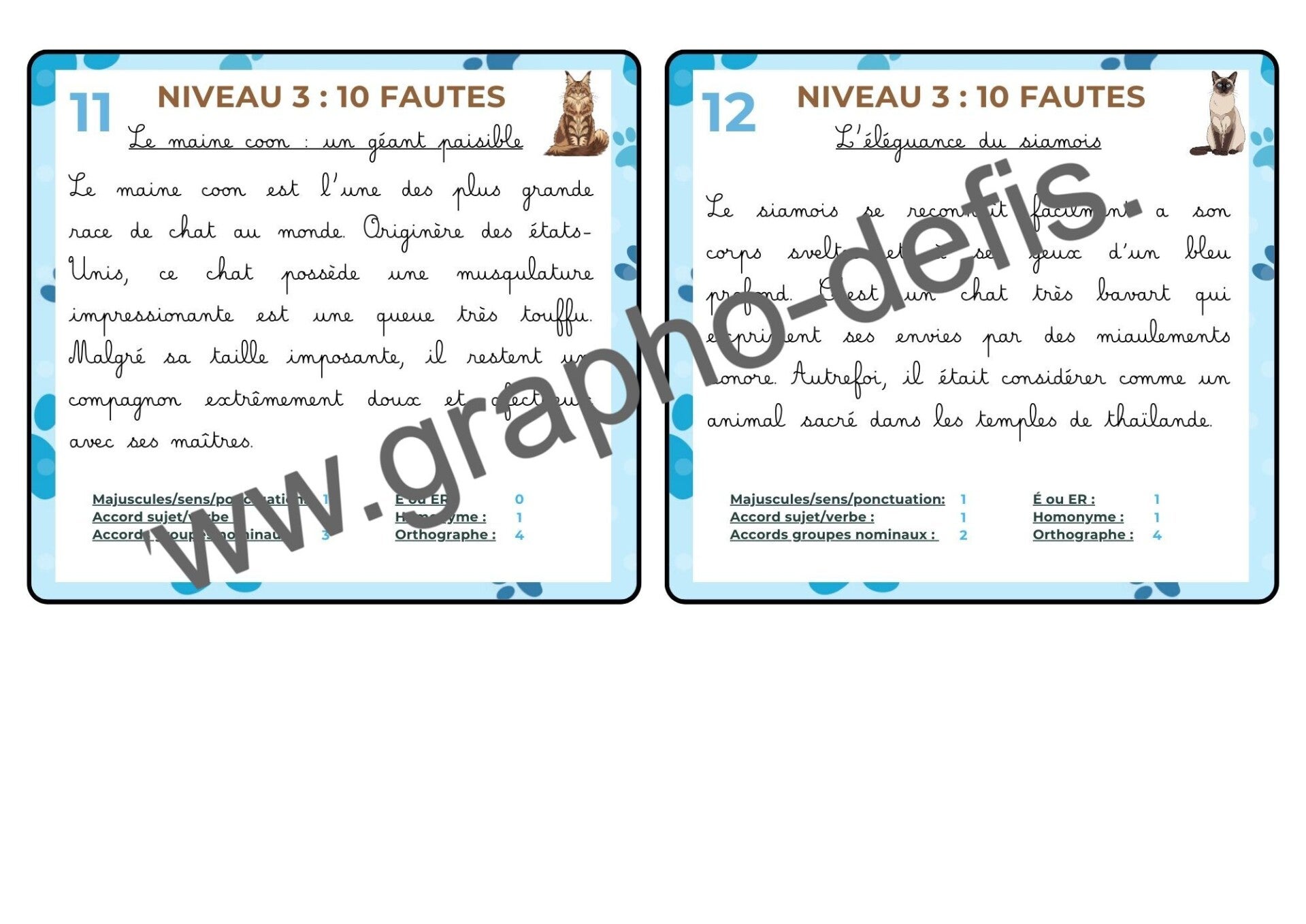niveaux 1 et 2 sur les caractéristiques et le comportement du chat (5 et 8 fautes à retrouver)