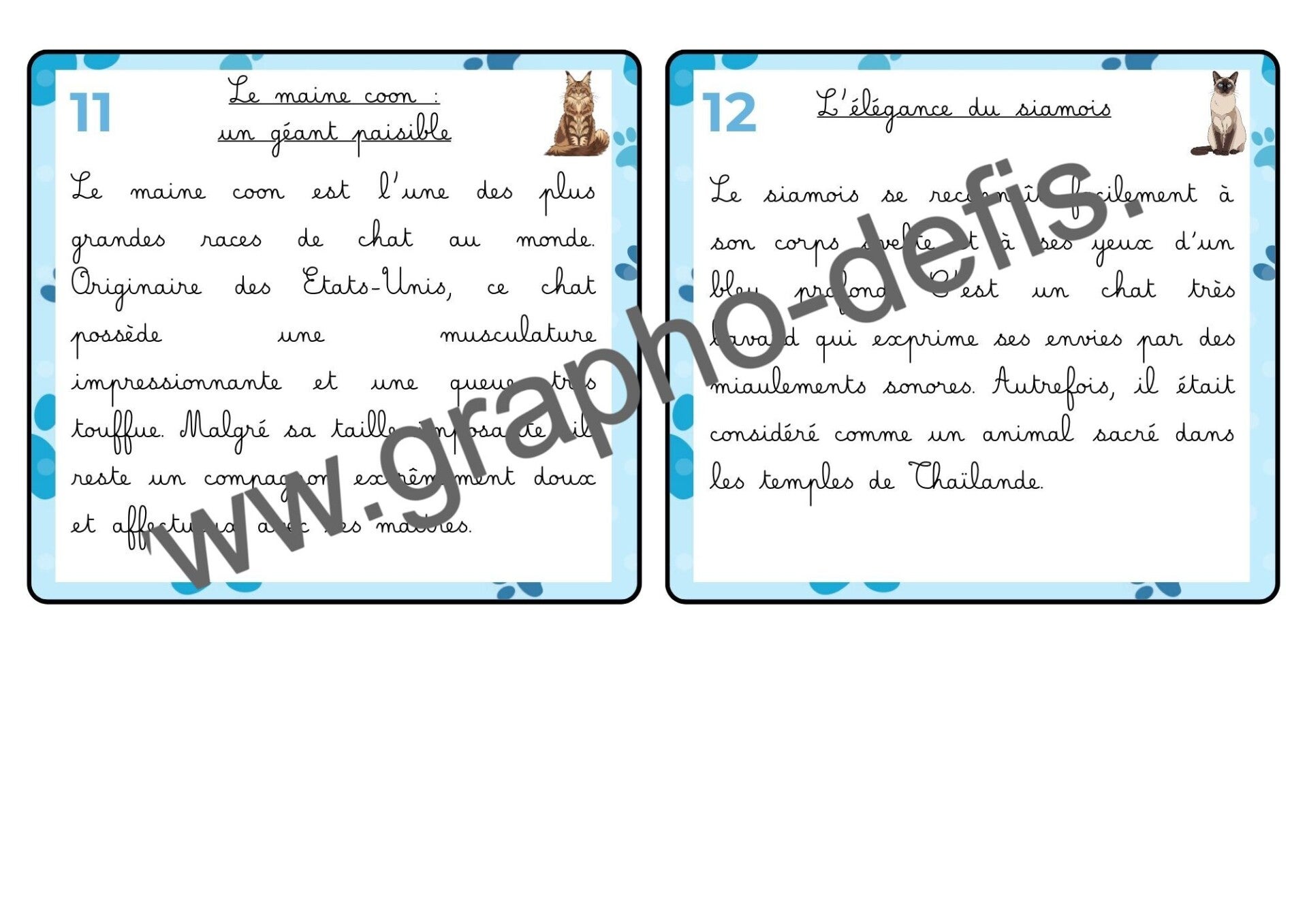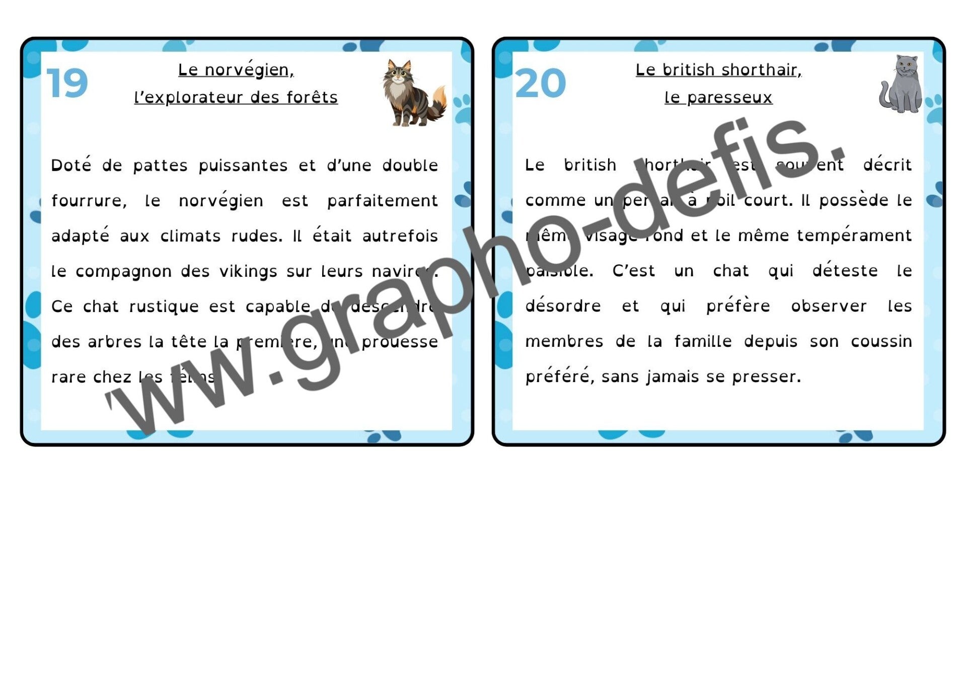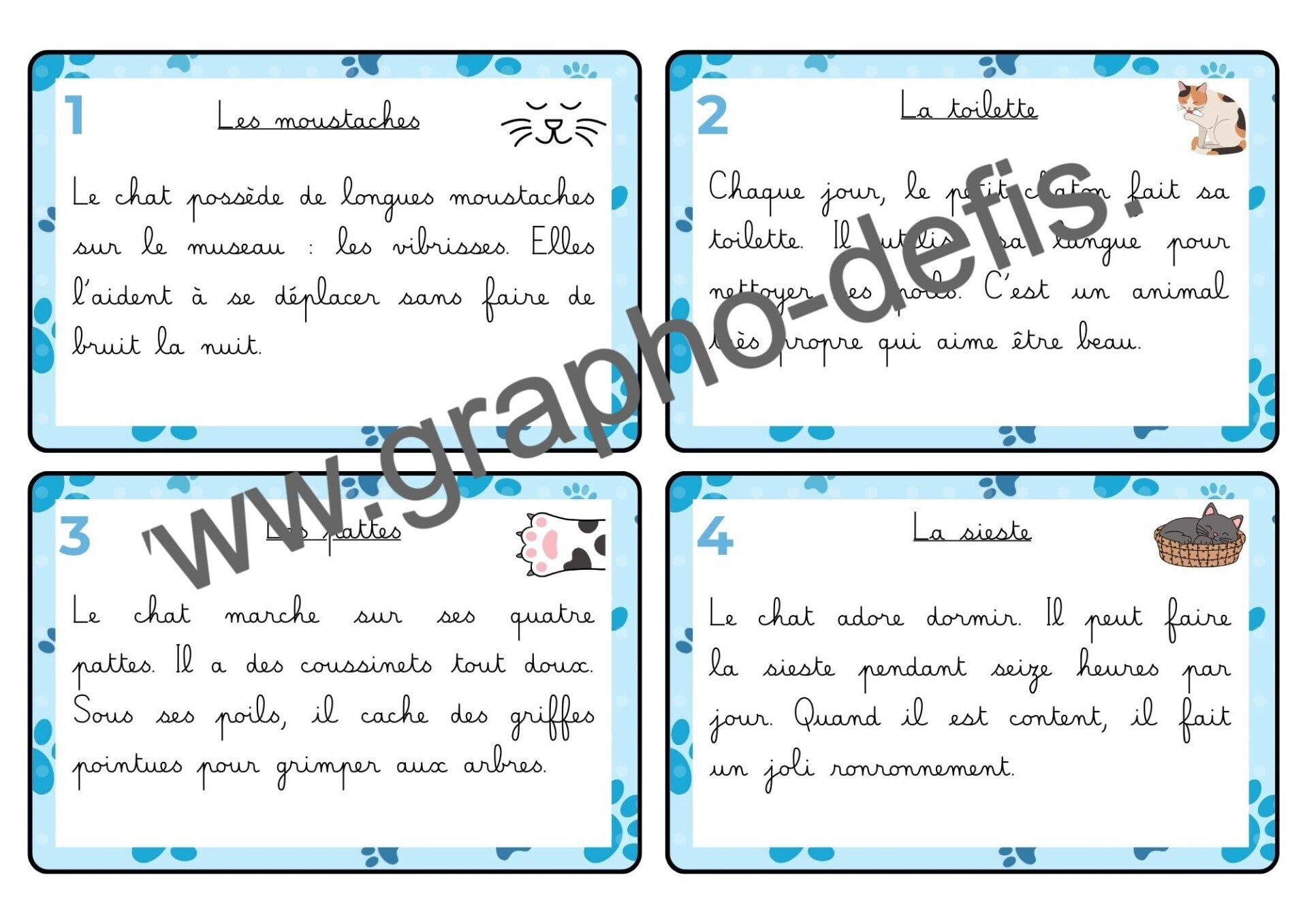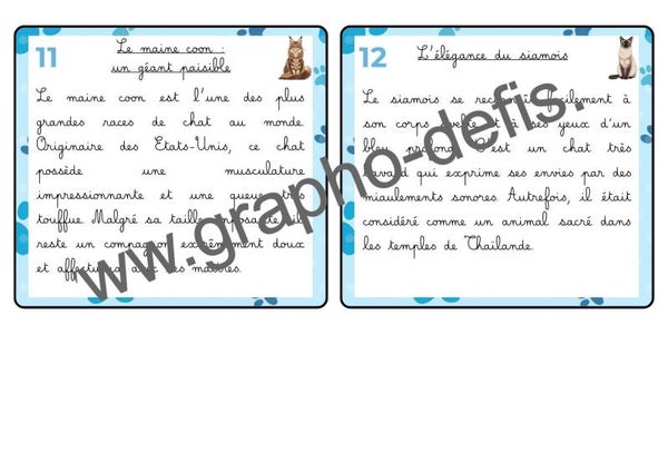 Un rallye copie de 20 petits textes sur le chat avec 2 niveaux de difficultés en police belle allure et opendys.