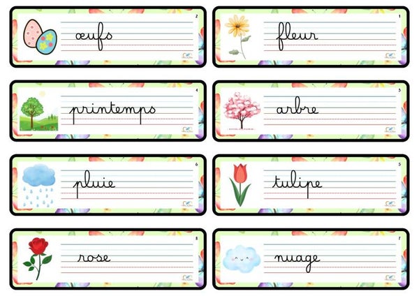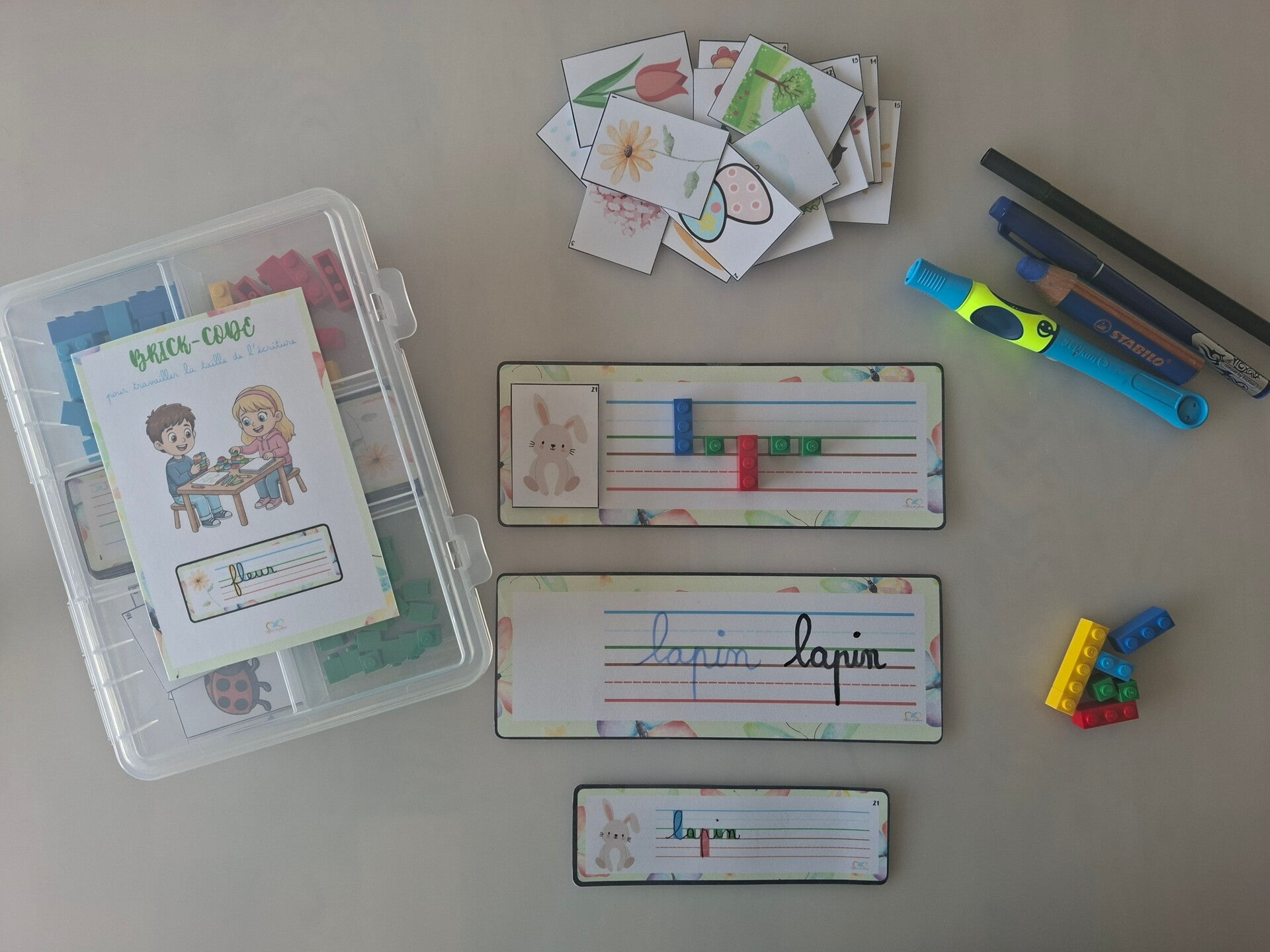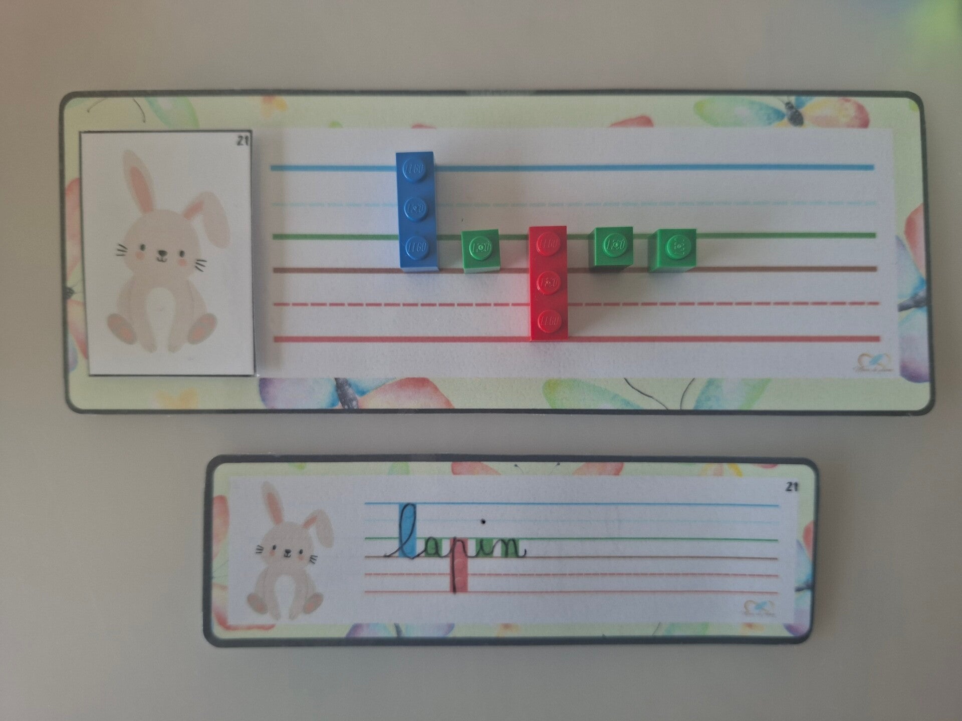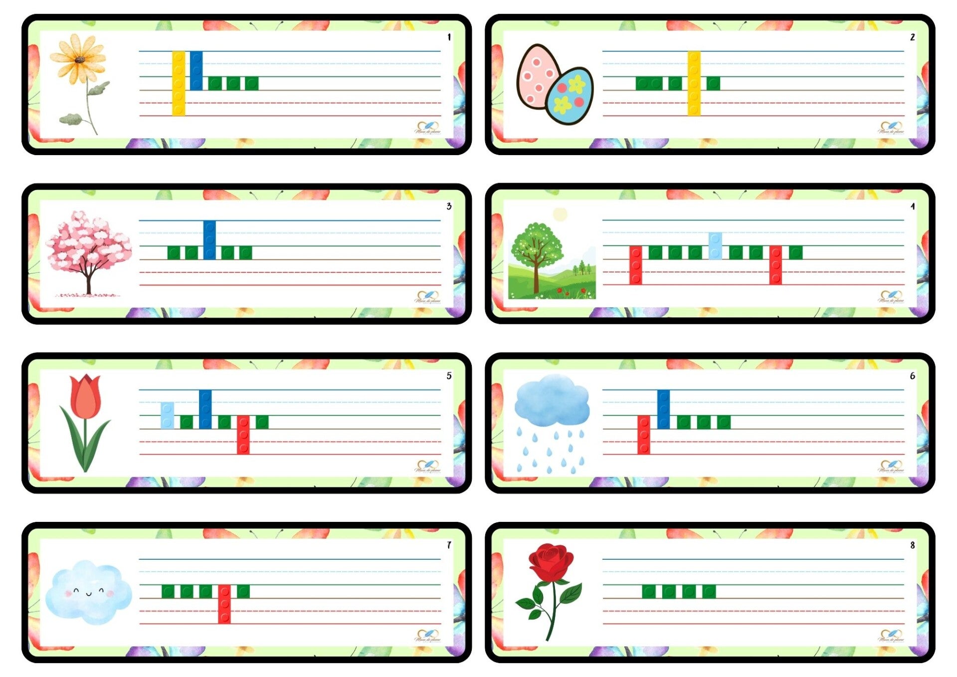 Un petit jeu mêlant écriture et petites briques pour travailler la dimension, l'espacement de l'écriture sur le thème du printemps.