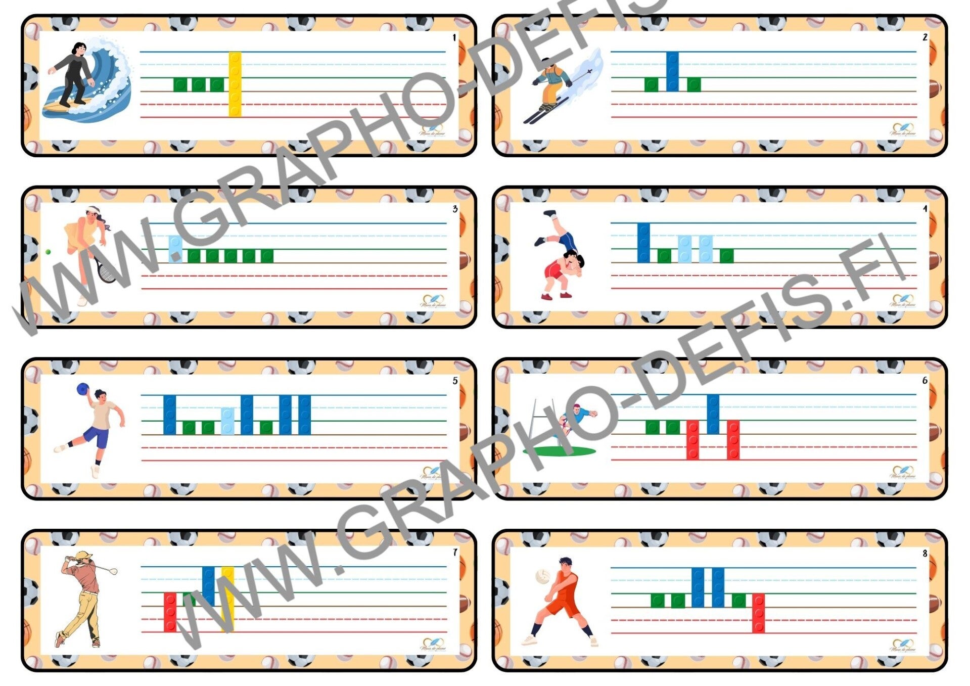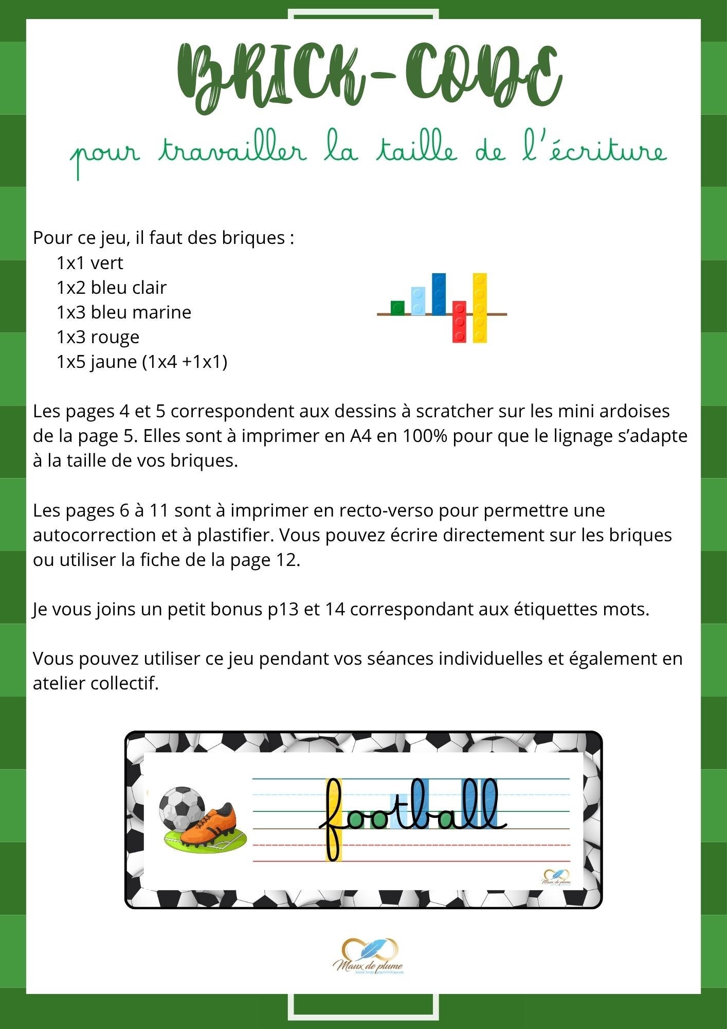 Un petit jeu mêlant écriture et petites briques pour travailler la dimension, l'espacement de l'écriture.